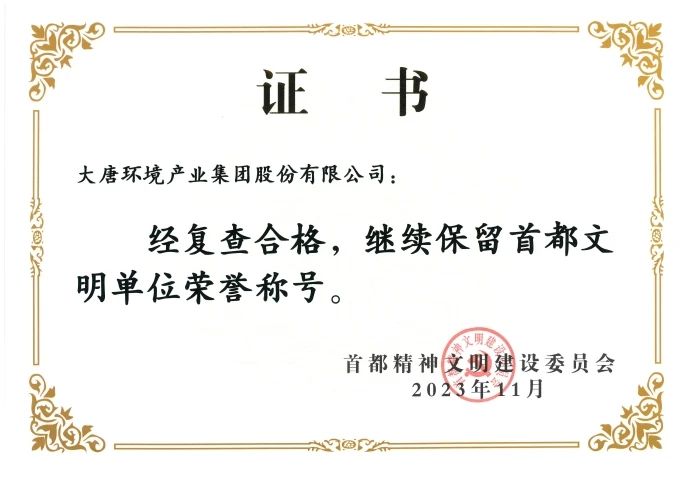 本网讯?近日,首都精神文明建设委员会颁发了“首都文明单位”复查合格证书,大唐环境产业集团股份有限公司继2015年获得“首都文明单位”称号后,顺利通过复查,连续保持9年“首都文明单位”称号。