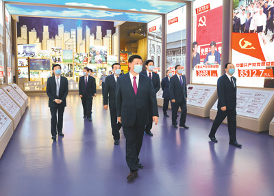气势磅礴的长城主题漆画、马克思《布鲁塞尔笔记》第四笔记本手稿、一大会址复原场景、革命根据地的创建展板、遵义会议复原景观、党的七大投票箱、开国大典影像、抗美援朝战争中使用过的武器、《解放思想,实事求是,团结一致向前看》讲话提纲、创办经济特区图片、脱贫攻坚数据图表、火神山雷神山医院模型……珍贵的文物实物、翔实的档案资料、生动的图片视频、逼真的复原景观,吸引了习近平等领导同志的目光。他们不时停下脚步仔细观看,认真听取讲解,详细询问有关情况。