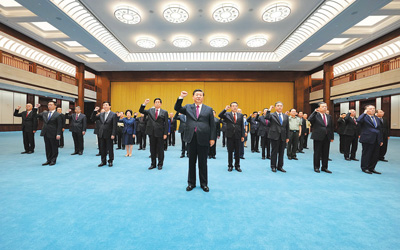 6月18日,党和国家领导人习近平、李克强、栗战书、汪洋、王沪宁、赵乐际、韩正、王岐山等在中国共产党历史展览馆参观“‘不忘初心、牢记使命’中国共产党历史展览”。这是参观结束后,习近平带领党员领导同志一起重温入党誓词。新华社记者?李学仁摄